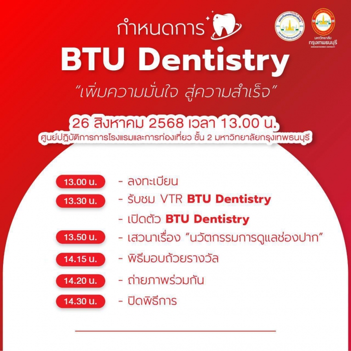 โดย ศ.ดร.บังอร เบ็ญจาธิกุล อธิการบดีมหาวิทยาลัยกรุงเทพธนบุรี เป็นประธานในการเปิดงานเปิดตัวครั้งใหญ่ กับ ผลิตภัณฑ์ใหม่ BTU Dentistry ยาสีฟัน ภายใต้คอนเซปต์ “เพิ่มความมั่นใจ สู่ความสำเร็จ”ที่คิดค้นและวิจัยโดย “คณะทันตแพทยศาสตร์ มหาวิทยาลัยกรุงเทพธนบุรี” ร่วมกับ “มูลนิธิทันตนวัตกรรมในพระบรมราชูปถัมภ์” โดยใช้หญ้าแฝกที่ผ่านการรับรอง GAP จากกรมวิชาการเกษตร ซึ่งสารสกัดจากหญ้าแฝกช่วยลดอาการเหงือกอักเสบ ดูแลสุขภาพเหงือกและฟัน พร้อมฟลูออไรด์ 1450 ppm ช่วยป้องกันฟันผุ