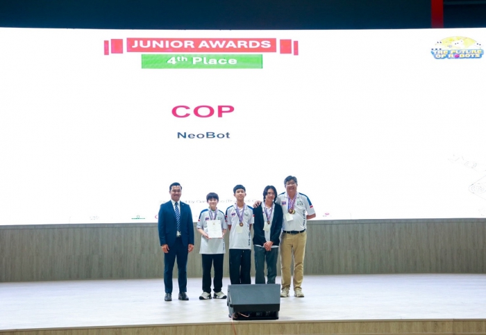 อาจารย์สมมาตร ทองคำ คณบดีคณะวิศวกรรมศาสตร์ ผู้แทนอธิการบดี และ ดร.นวลวรรณ ชะอุ่ม ประธานโครงการ WRO ประเทศไทย ร่วมมอบรางวัลแก่ ทีมแชมป์ตัวแทนประเทศไทย ทีมชนะเลิศเตรียมตัวสู่เวทีโลกแข่งขัน ระดับนานาชาติ ณ สิงคโปร์