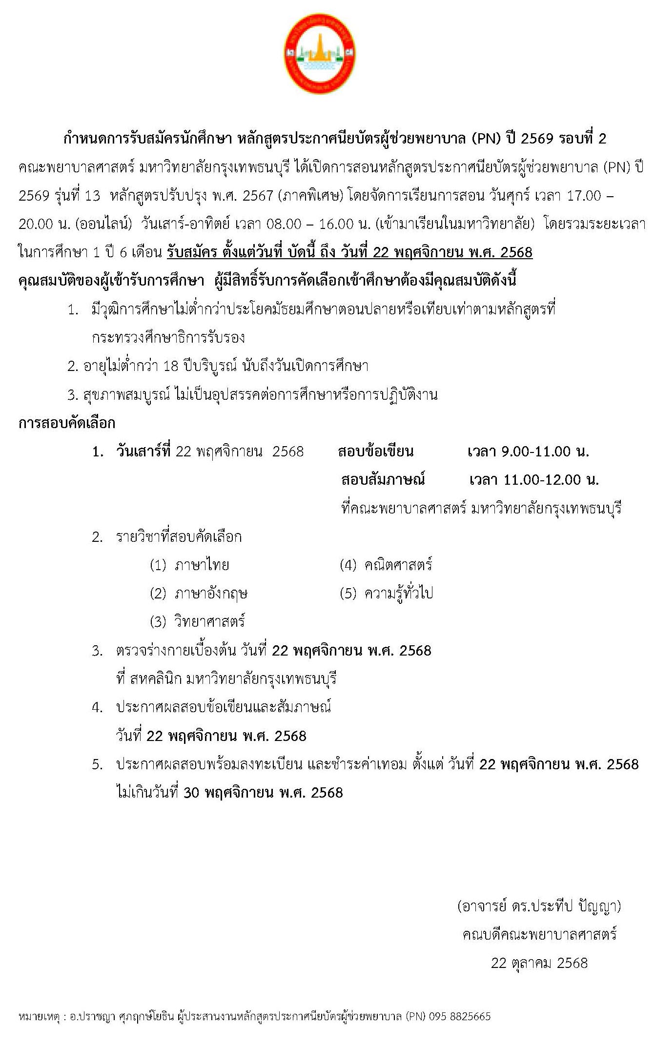 กำหนดการรับสมัครนักศึกษา หลักสูตรประกาศนียบัตรผู้ช่วยพยาบาล (PN) ปี 2569