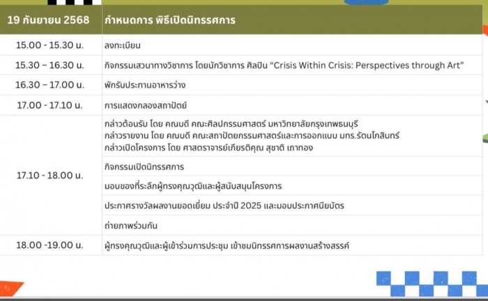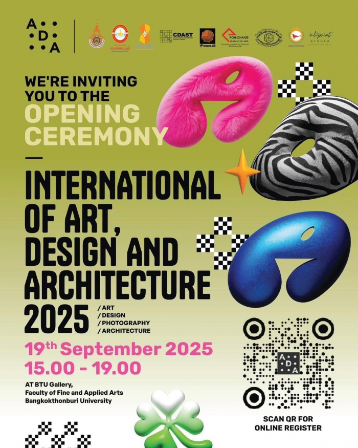 คณะศิลปกรรมศาสตร์ มหาวิทยาลัยกรุงเทพธนบุรี ร่วมกับคณะสถาปัตยกรรมศาสตร์และการออกแบบ มหาวิทยาลัยเทคโนโลยีราชมงคลรัตนโกสินทร์ และพันธมิตรทางวิชาการทั้งในประเทศและต่างประเทศ ขอเชิญร่วมงาน พิธีเปิดการจัดแสดงผลงานศิลปะ ออกแบบ และสถาปัตยกรรมนานาชาติ 2025 (International of Art, Design and Architecture Exhibition 2025) ในวันศุกร์ที่ 19 กันยายน 2568