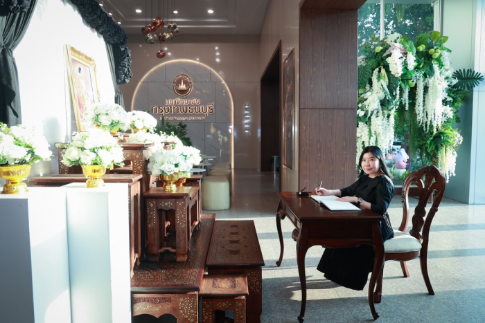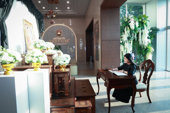 การจัดพิธีถวายความอาลัยในวันนี้ จึงเป็นการรวมใจของชาวมหาวิทยาลัยกรุงเทพธนบุรี ที่จะน้อมรำลึกถึงพระมหากรุณาธิเป็นล้นพ้น อันหาที่สุดมิได้ และยืนยันความมุ่งมั่นที่จะ สืบสานและต่อยอดพระราชปณิธาน ในการสร้างคน สร้างความรู้ และสร้างสรรค์สังคมตามแนวทางแห่งความผาสุกและความยั่งยืนที่พระองค์ได้ทรงวางรากฐานไว้ จึงตั้งมั่นที่จะสืบสานพระราชปณิธานแห่งความดีงามและทำนุบำรุงประเทศชาติสืบไป