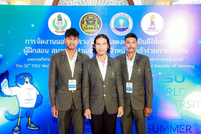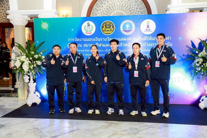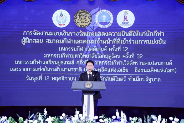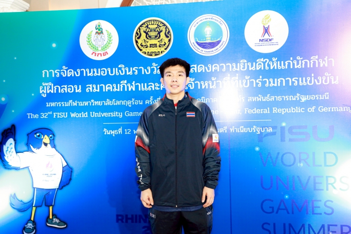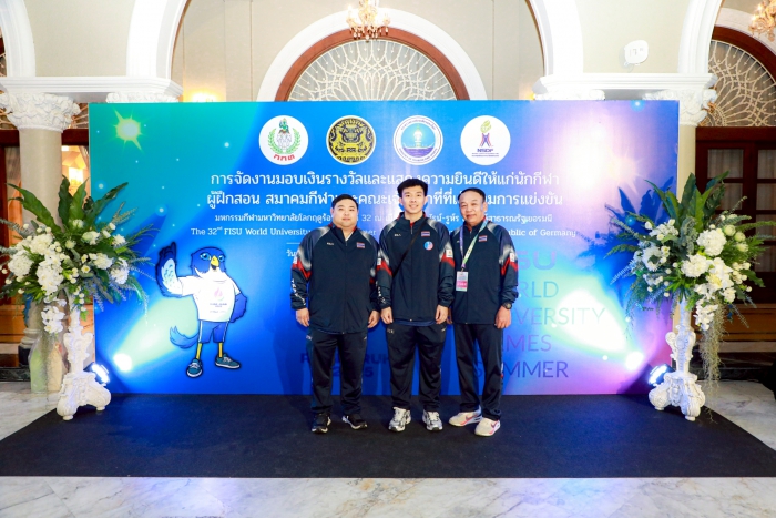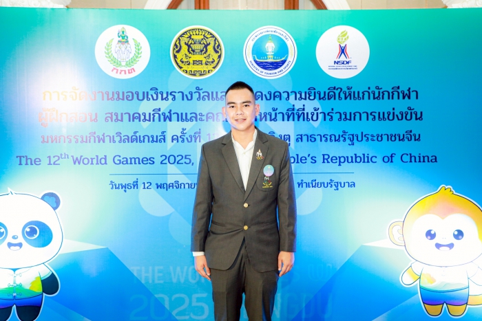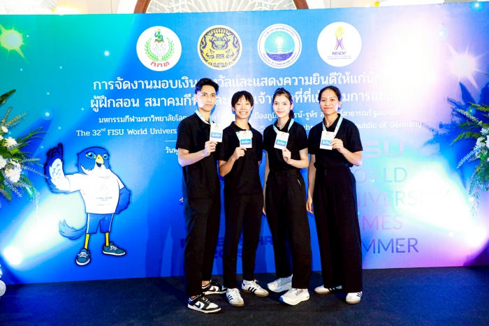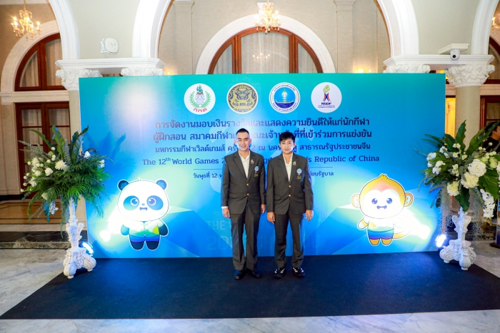 นักกีฬาของมหาวิทยาลัยกรุงเทพและตัวแทนทีมชาติไทยเข้ารับเงินรางวัลจากนายอรรถกร  ศิริลัทธยากร  รัฐมนตรีว่าการกระทรวงการท่องเที่ยวและกีฬาในโอกาสเป็นประธานในงานมอบเงินรางวัลและแสดงความยินดีให้แก่นักกีฬา  ผู้ฝึกสอน  สมาคมกีฬา  และคณะเจ้าหน้าที่ที่เข้ารวมการแข่งขันมหกรรมกีฬาเวิลด์เกมส์  ครั้ง 12 ที่นครเฉิงตู  สาธารณรัฐประชาชนจีน  การแข่งขันมหกรรมกีฬามหาวิทยาลัยโลกฤดูร้อน  ครั้งที่ 32 ที่เมืองภูมิภาคไรน์-รูห์ร  สหพันธ์สาธารณรัฐเยอรมันนี  และรายการแข่งขันกีฬาระดับนานาชาติรายการต่าง ๆ ในปีนี้  ซึ่งรัฐบาลจัดขึ้นที่ตึกสันติไมตรี  ทำเนียบรัฐบาล