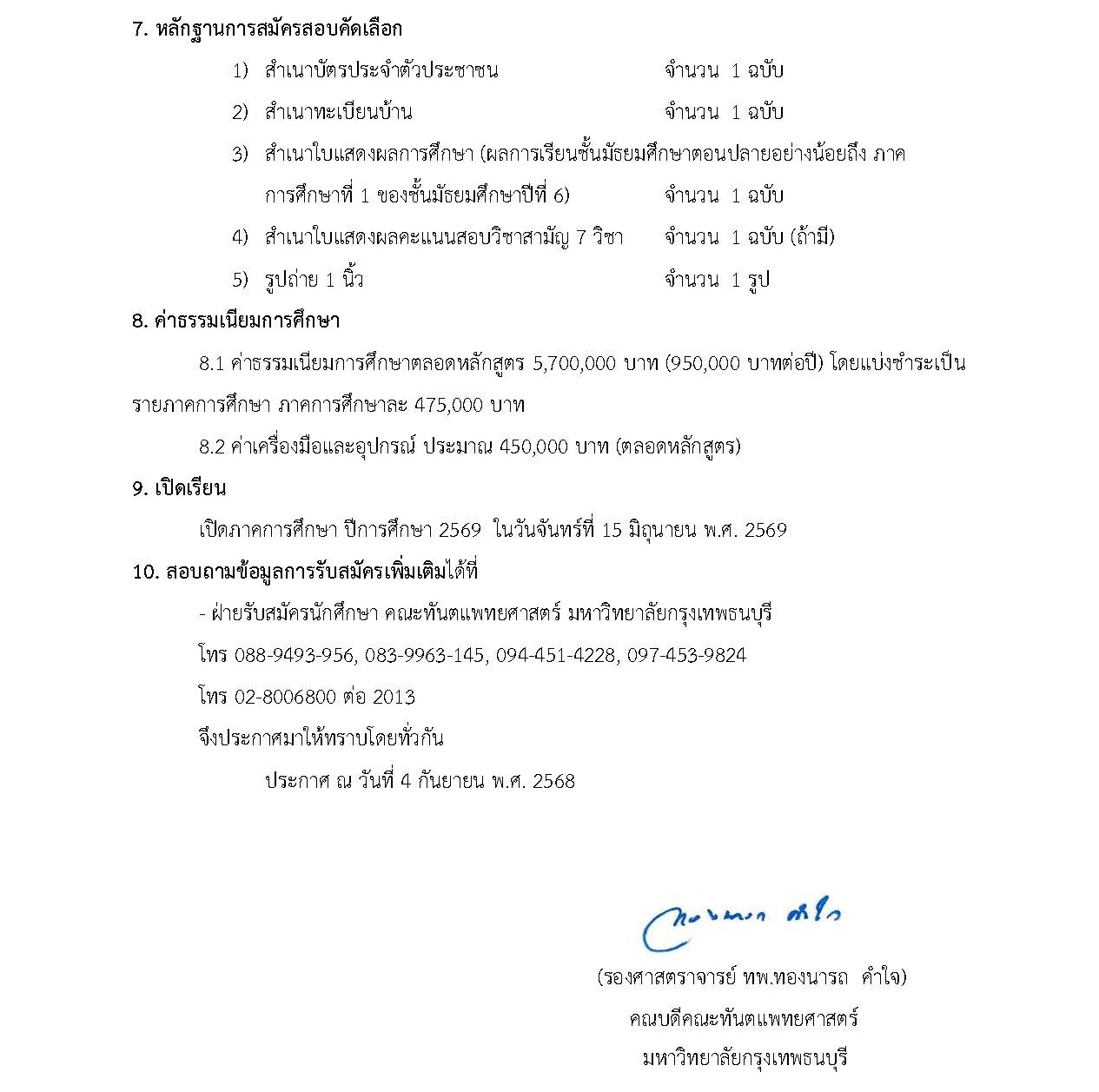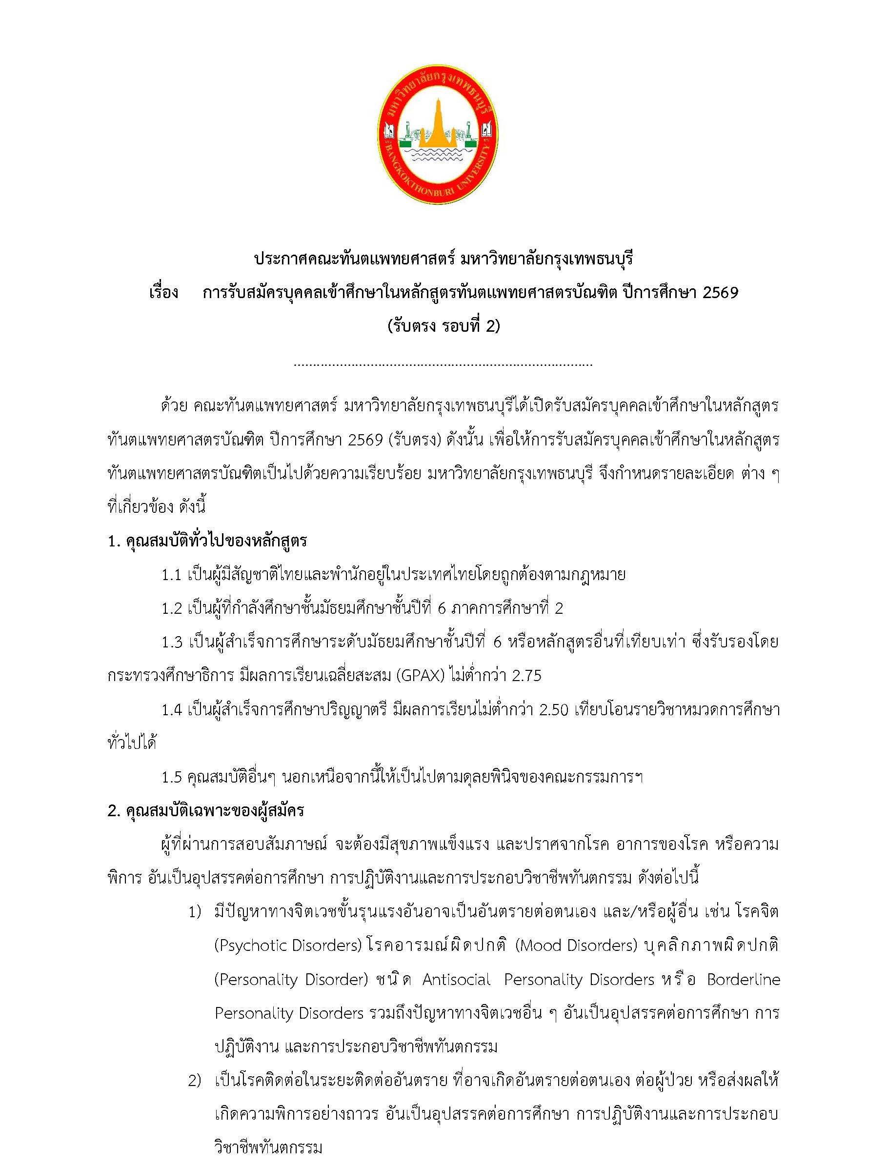 คณะทันตแพทยศาสตร์ มหาวิทยาลัยกรุงเทพธนบุรี เปิดรับสมัครบุคคลเข้าศึกษาในหลักสูตรทันตแพทยศาสตรบัณฑิต ปีการศึกษา 2569