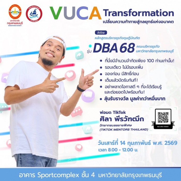 หลักสูตร DBA 68 ม.กรุงเทพธนบุรี เปิดเวทีพิเศษ "VUCA Transformation" ชวนคุณมาฟังเคล็ดลับการปรับตัวทางธุรกิจ พร้อมหาไอเดียใหม่ๆ ไปต่อยอดกิจการให้เติบโตในยุคที่โลกเปลี่ยนไว
