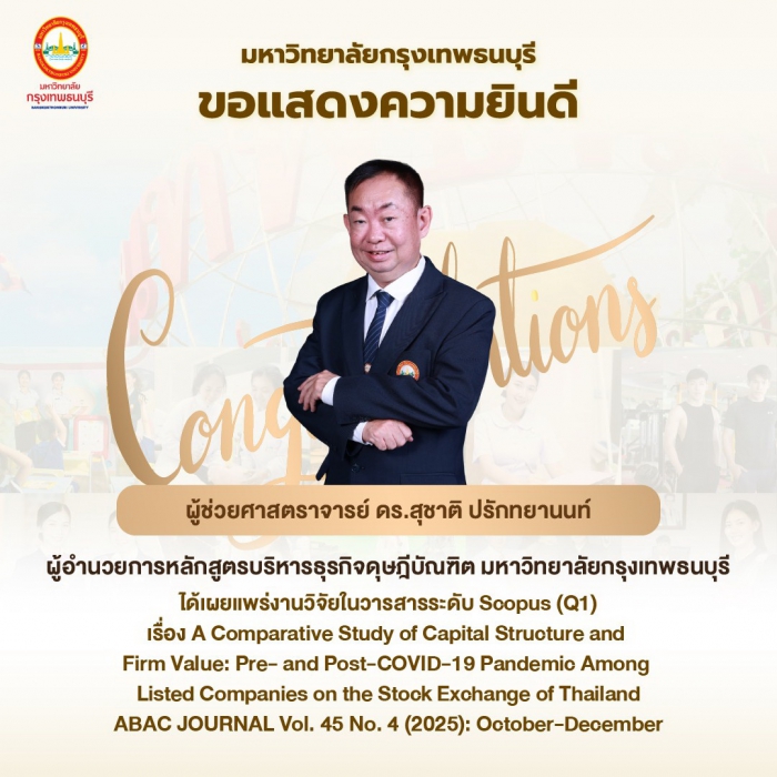ขอแสดงความยินดีกับ ผู้ช่วยศาสตราจารย์ ดร.สุชาติ ปรักทยานนท์ ผู้อำนวยการหลักสูตรบริหารธุรกิจดุษฎีบัณฑิต มหาวิทยาลัยกรุงเทพธนบุรี ที่ได้เผยแพร่งานวิจัยในวารสารระดับ Scopus(Q1) เรื่อง A Comparative Study of Capital Structure and Firm Value: Pre- and Post-COVID-19 Pandemic Among Listed Companies on the Stock Exchange of Thailand