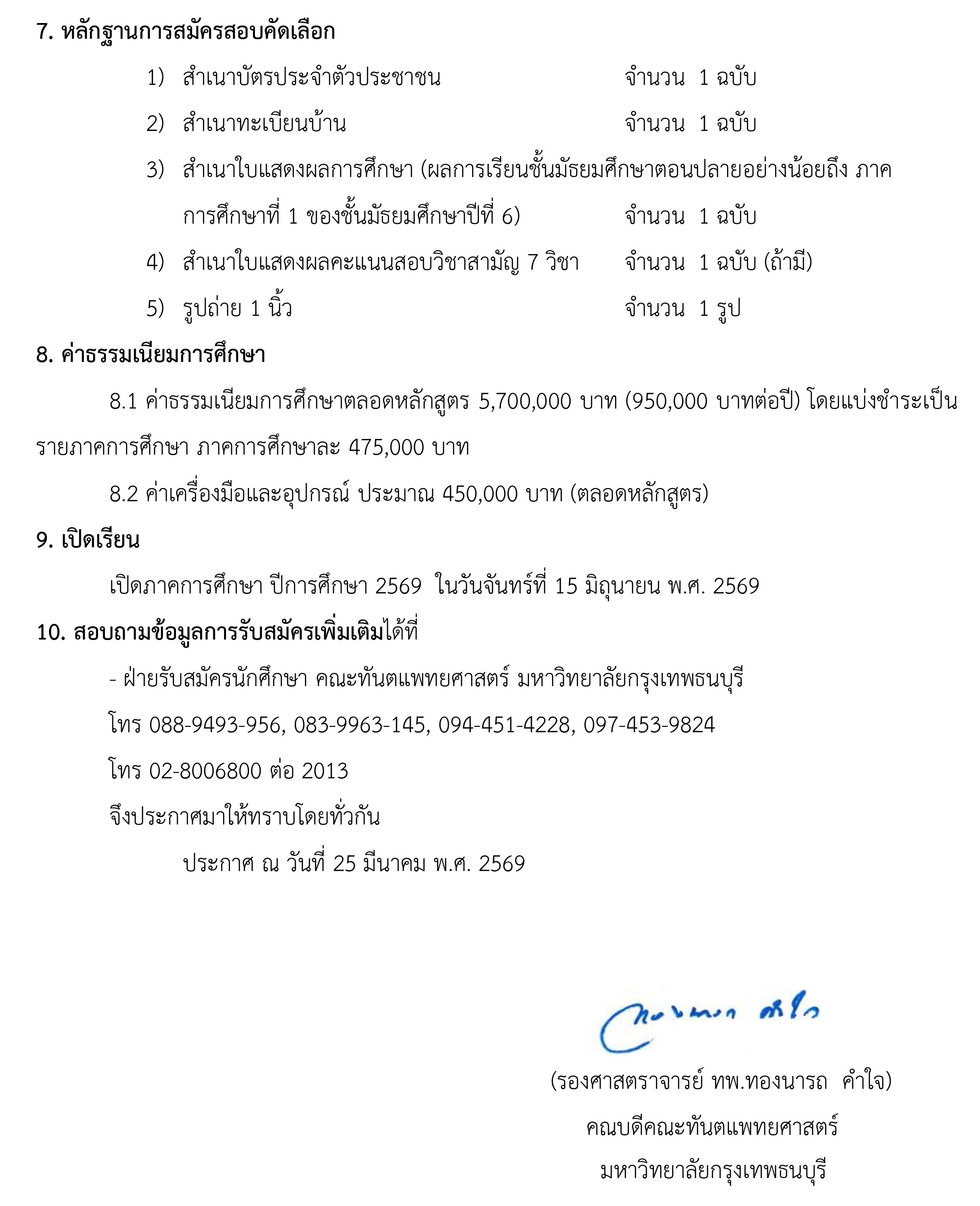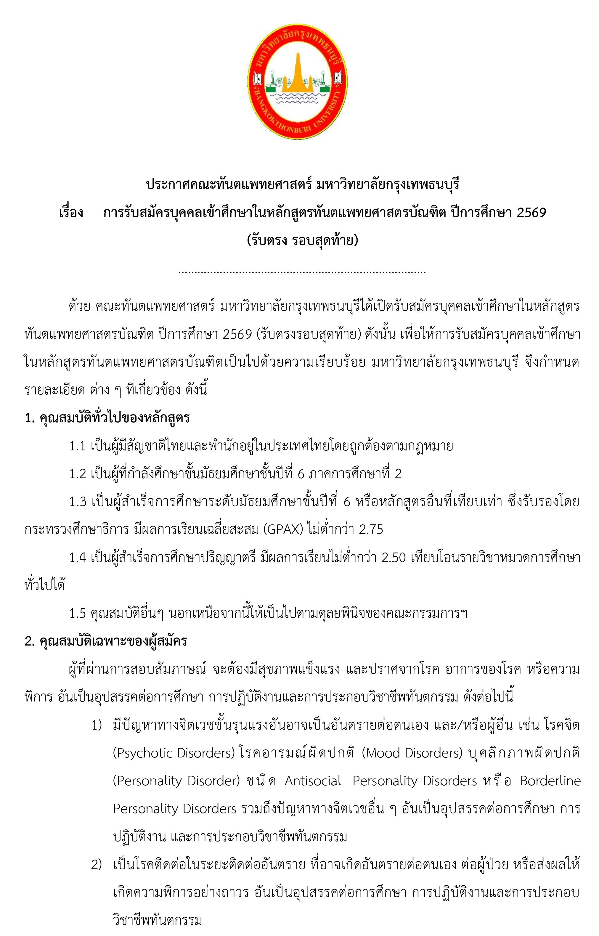 คณะทันตแพทยศาสตร์ มหาวิทยาลัยกรุงเทพธนบุรี รับสมัครบุคคลเข้าศึกษาในหลักสูตรทันตแพทยศาสตรบัณฑิต ปีการศึกษา 2569