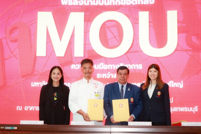วันที่ 21 เมษายน 2569 ศาสตราจารย์ (พิเศษ) ดร.ดวงฤทธิ์ เบ็ญจาธิกุล ชัยรุ่งเรือง ให้เกียรติเป็นประธานในพิธีลงนามในบันทึกข้อตกลงความร่วมมือระหว่างมหาวิทยาลัยกรุงเทพธนบุรี (มกธ.) กับ “เชฟตง” คุณวรเจตน์ เจริญวงศ์ใหม่ ประธานค่าย Junior Chef Camp ตามโครงการกิจกรรม “Junior Chef Camp” เพื่อเสริมสร้างองค์ความรู้ ส่งเสริมการศึกษา และการพัฒนาทักษะด้านการทำอาหารให้กับเยาวชนรุ่นใหม่ รวมทั้งกระตุ้นให้เยาวชนนักเรียน นักศึกษา หรือบุคคลที่สนใจเข้าร่วมในกิจกรรม “Junior Chef Camp” ด้วย