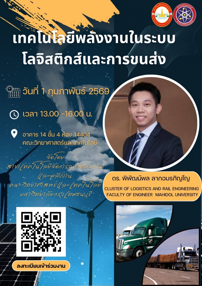 คณะวิทยาศาสตร์และเทคโนโลยี สาขาวิชาเทคโนโลยีจัดการอุตสาหกรรมและพลังงาน ขอเชิญร่วมโครงการสัมมนาเชิงวิชาการเรื่อง เรื่อง “เทคโนโลยีพลังงานในระบบโลจิสติกส์และการขนส่ง”