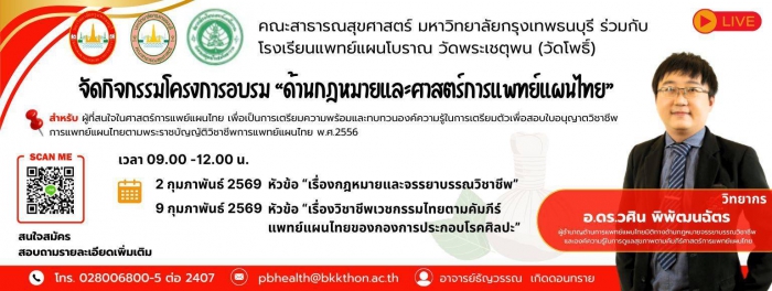 คณะสาธารณสุขศาสตร์ มหาวิทยาลัยกรุงเทพธนบุรี ร่วมกับ โรงเรียนแพทย์แผนโบราณ วัดพระเชตุพน (วัดโพธิ์) สำหรับผู้สนใจในศาสตร์การแพทย์แผนไทย เพื่อเตรียมความพร้อมและทบทวนองค์ความรู้ในการสอบใบอนุญาตวิชาชีพการแพทย์แผนไทยตามพระราชบัญญัติวิชาชีพการแพทย์แผนไทย พ.ศ. 2556 กำหนดการอบรม (เวลา 09.00 – 12.00 น.) วันที่ 2 กุมภาพันธ์ 2569 หัวข้อ “กฎหมายและจรรยาบรรณวิชาชีพ” วันที่ 9 กุมภาพันธ์ 2569 หัวข้อ “วิชาชีพเวชกรรมไทยตามคัมภีร์แพทย์แผนไทยของกองการประกอบโรคศิลปะ” วิทยากร อาจารย์ ดร.วศิน…
