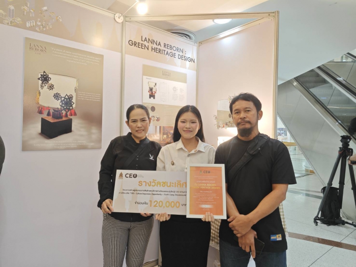 คณะศิลปกรรมศาสตร์ขอชื่นชมในความมุ่งมั่น ความคิดสร้างสรรค์ และศักยภาพด้านการพัฒนางานวัฒนธรรมเชิงนวัตกรรมของนักศึกษา ที่สามารถผสานความรู้ด้านศิลปะ การออกแบบ และทุนทางวัฒนธรรมเข้าด้วยกันได้อย่างโดดเด่น จนได้รับการยอมรับจากคณะกรรมการในโครงการครั้งนี้ ขอให้ความสำเร็จครั้งนี้เป็นอีกหนึ่งก้าวที่สำคัญในการเป็นผู้นำรุ่นใหม่ที่ใช้วัฒนธรรมขับเคลื่อนสังคมอย่างสร้างสรรค์ คณะขอเป็นกำลังใจให้ก้าวต่อไปอย่างงดงามและมั่นคงค่ะ ขอขอบคุณผู้ดูแลอาจารย์ภัทริญา มีแสงแก้ว และ อาจารย์ฐิติกา ชาญชัยศรี (อาจารย์ล่ามภาษามือ)…